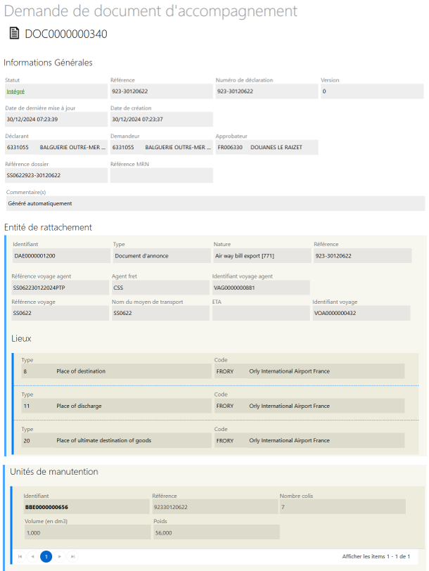 Je visualise l’identifiant de l’unité de manutention et les données qui lui sont liées issues du document d'annonce.