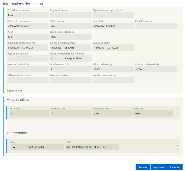 Je visualise les informations de la déclaration. Sont reprises les informations liées à la procédure en douane et aux marchandises.