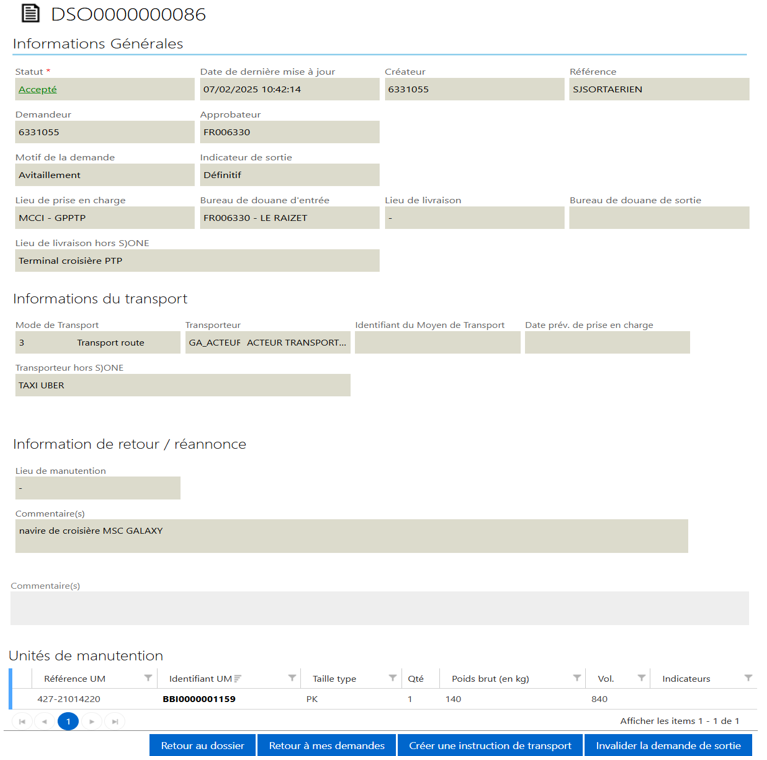 Je peux cliquer sur le bouton « Retour à mes demandes » pour accéder à toutes mes demandes d'autorisation (transfert, sortie, amendement, validation du manifeste, etc.) ou « Retour au dossier ».