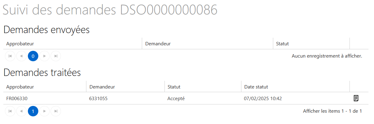 Deux listes permettent de différencier les « Demandes envoyées » et les « Demandes traitées ».