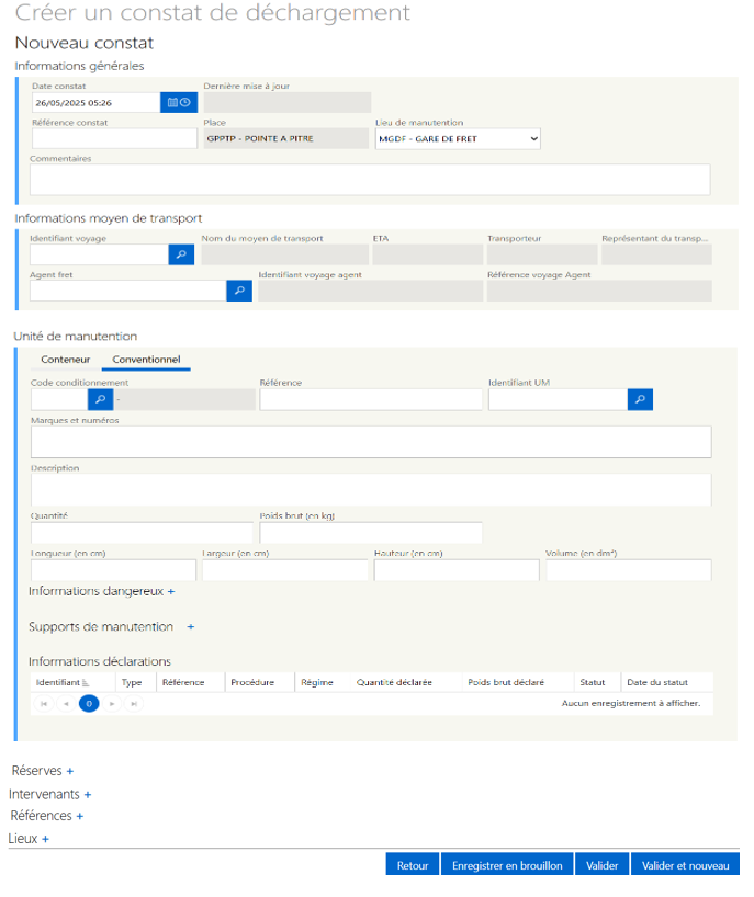 Le formulaire « Créer un constat de déchargement » s’affiche.