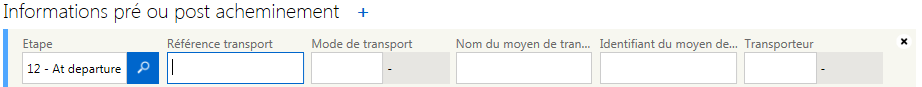 Je renseigne l’étape grâce à l’autocomplétion, la référence de transport et le mode de transport (ex. : 4 pour transport aérien), puis le nom du moyen de transport, l’identifiant du moyen de transport et le nom du transporteur grâce à l’autocomplétion.