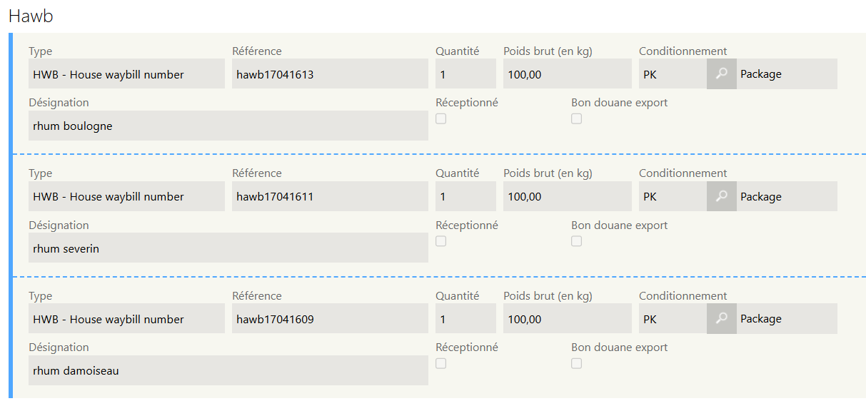 Si des informations concernant des House waybill ont été annoncées dans le document d'annonce, elle s'affichent en lecteur seule.
