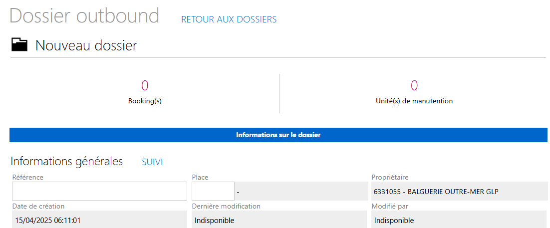 Un formulaire « Dossier Outbound - Nouveau dossier » s’affiche.