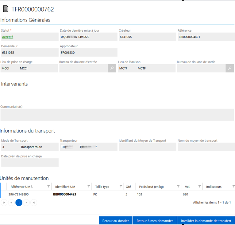 La demande de transfert est une demande de déplacement d'une unité de manutention d’un lieu cédant vers un lieu prenant.