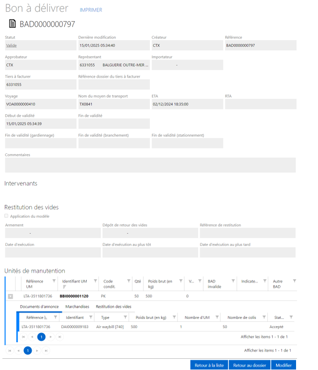 Je le consulte à l'aide de l'icône « loupe » et visualise la liste des unités de manutention qui possèdent chacune un indicateur « BAD invalide ».