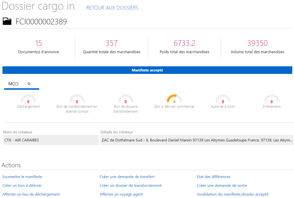 Le dossier Cargo In est créé par la compagnie aérienne par IHM ou est généré automatiquement lors de l'intégration dans S ONE du FFM transmis par la compagnie.