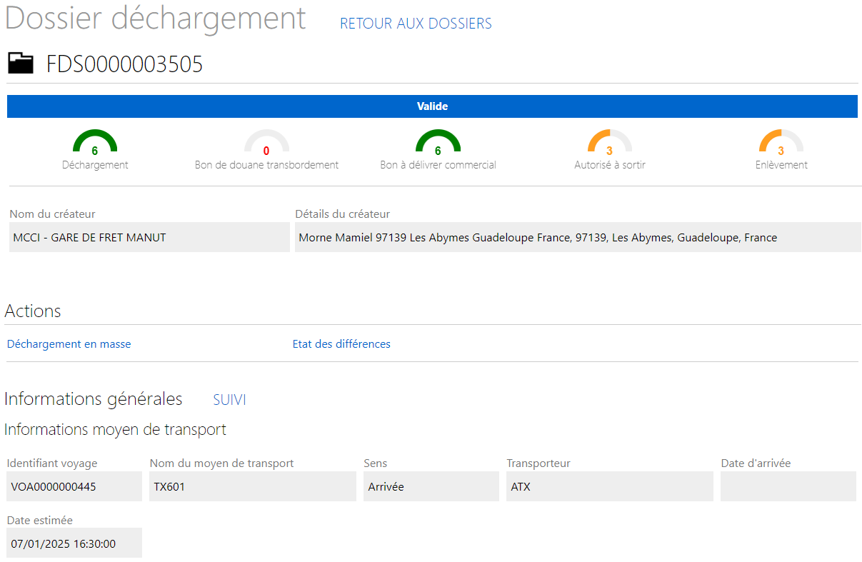 Écran d'un dossier de déchargement