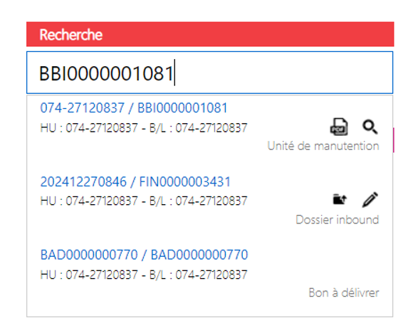 Ici je renseigne la référence de l'unité de manutention ou son identifiant, voire la référence ou l’identifiant de mon dossier dans le bloc « Recherche ».