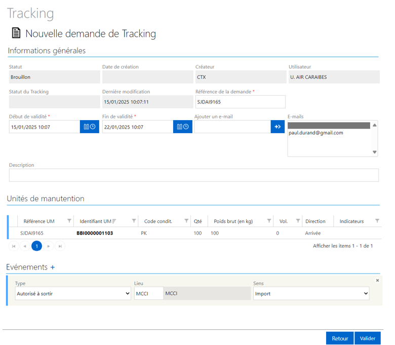 Je visualise ma demande de tracking au statut « Valide » dans les documents joints, elle porte un identifiant unique (ex. : TRK0000001234).