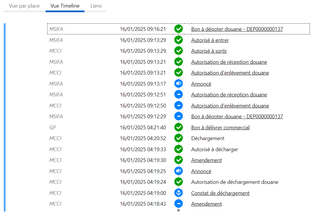 Ex: Tracing d'une unité de manutention à dépoter BBI0000001234 après acceptation de la demande d'autorisation de dépotage et demande de transfert acceptée.