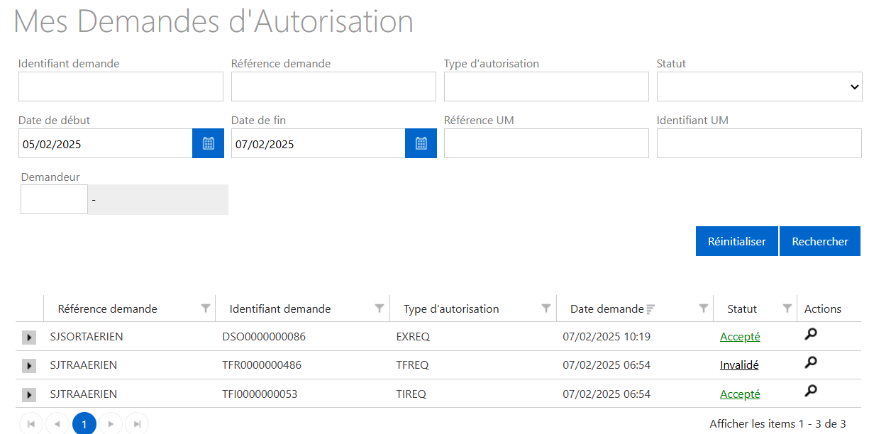 Depuis le tableau de données « Mes Demandes d’Autorisation », je visualise toutes mes demandes d’autorisation qui répondent aux critères de recherche choisis, quel que soit leur statut.