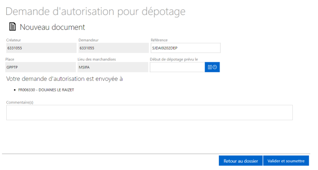 Les champs « Début de dépotage prévu le » et « Commentaires » sont facultatifs.
