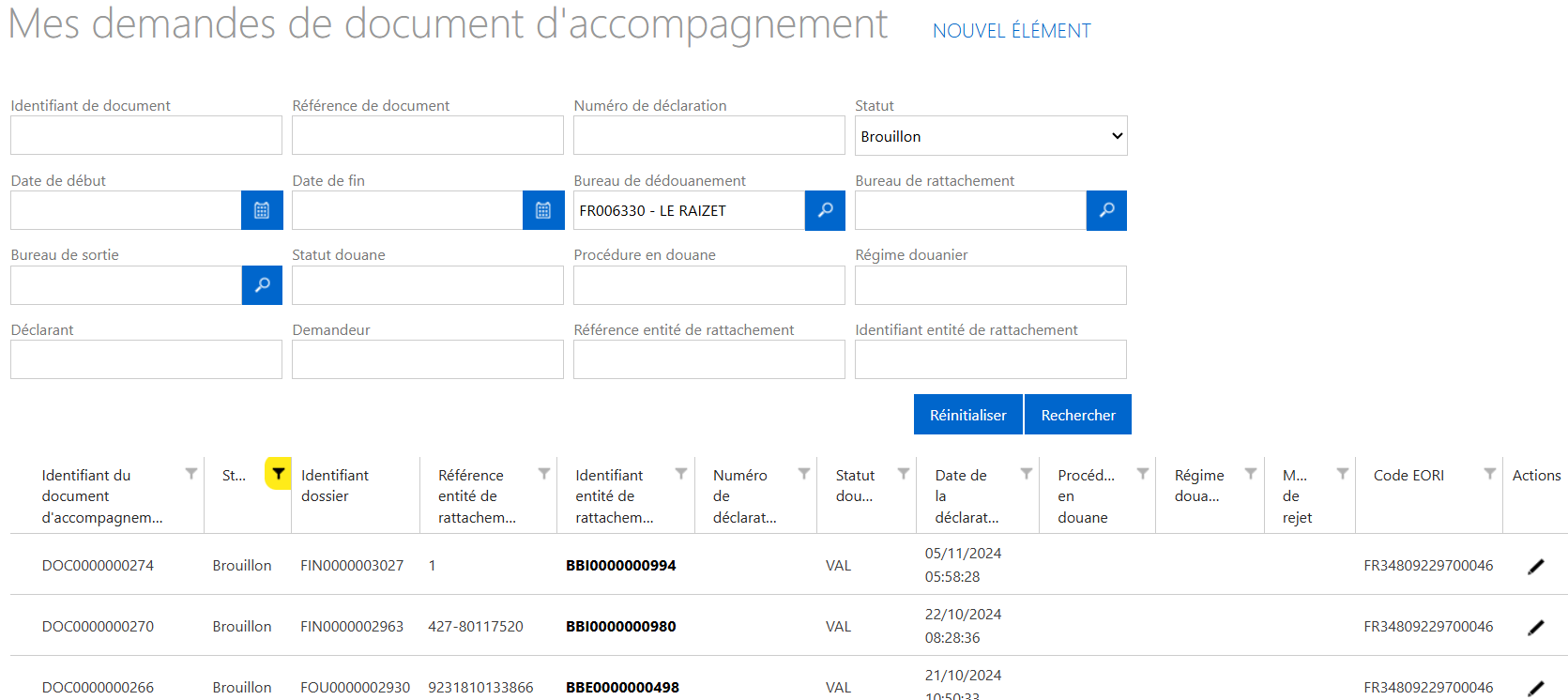 Une fois la demande de document d'accompagnement trouvée en statut brouillon, je clique sur l’icône « crayon » pour l’éditer.