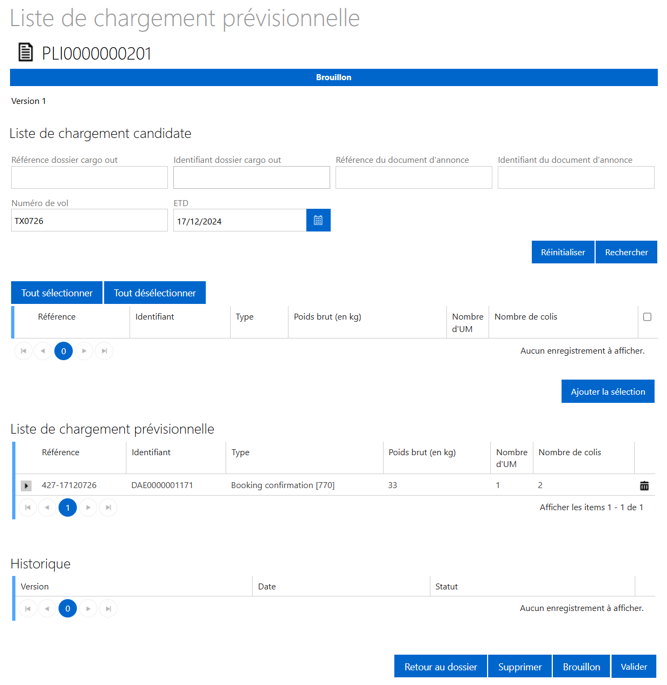 Je clique sur l'icône « loupe », le formulaire « Liste de chargement prévisionnelle » s'affiche.